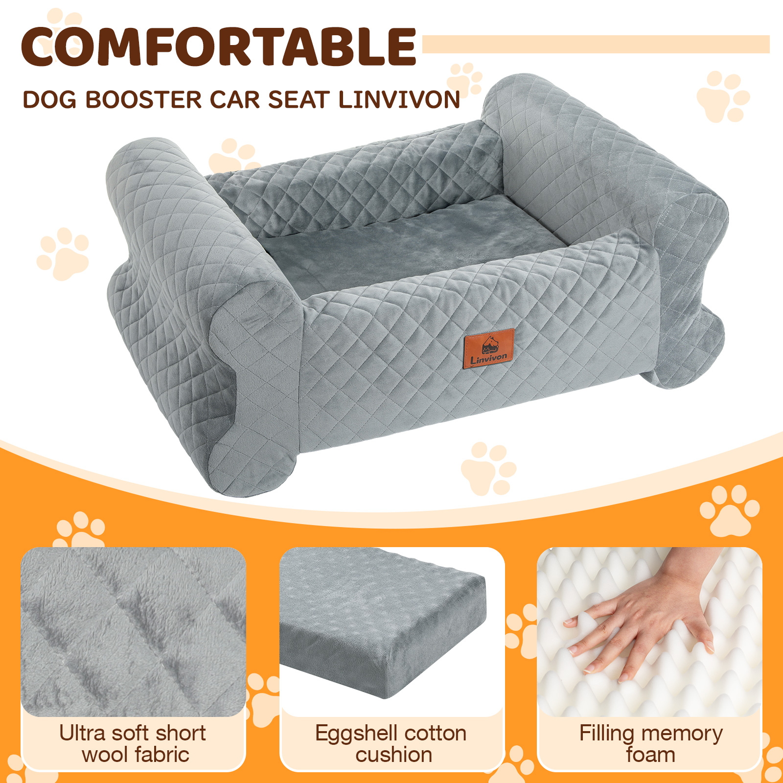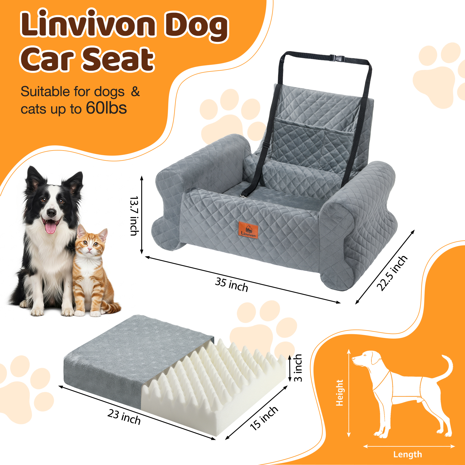 Linvivon Dog Car Seat for Medium/Large Dogs up to 60 lbs, Memory Foam Dog Booster Seat with Thick Cushion, Pet Car Seat for Back with Detachable Washable Cover, Storage Pockets for SUV, Pick Up, Trunk, Grey
