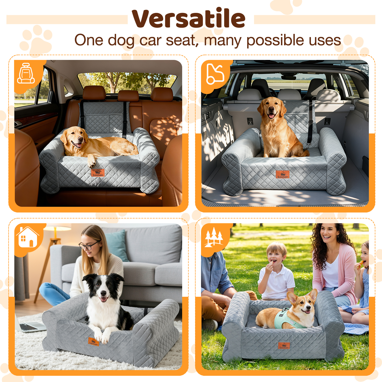 Perfectly Sized for Comfort: This 35″ L x 22.5″ W x 13.7″ H dog car seat offers a spacious yet cozy ride, securely fitting medium to large dogs or two small dogs in your car’s back seat or trunk. More than just a dog car seat, it easily doubles as a travel dog bed and a cozy sofa cushion at home, seamlessly adapting to your pet’s needs wherever you go.